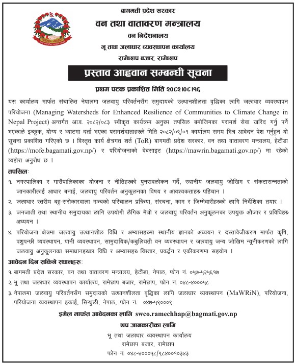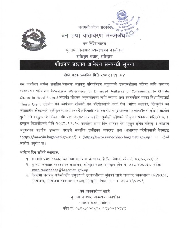 Climate change emerges as one of the biggest challenges to prosperity and sustainable development in Nepal. As a least developed country with a high poverty rate of 18.7% and a predominantly agrarian economy mainly influenced by the monsoon, Nepal is highly vulnerable to climate change. Nepal’s rugged topography and fragile geology also render it vulnerable to climate change. The Managing Watersheds for Enhanced Resilience of Communities to Climate Change in Nepal (MaWRiN) Project considers watershed approach to ensure the longer-term resilience of local and indigenous communities against climate emergencies. Funded by the Global Environment Facility (GEF), the project is implemented through an agreement between the World Wildlife Fund (WWF) (WWF GEF Agency) and the Ministry of Forests and Environment (Project Executing Agency), Government of Nepal, and the Ministry of Forests and Environment, Bagmati Province (Project Executing Partner).
